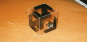できるだけ立方体内部の空間を犠牲にせずに、頑丈な構成をつくる骨組みの検証。透明の正方形プラ板6枚を、3方向に接続する鉄製ジョイントを4つを用いて組み立てた。